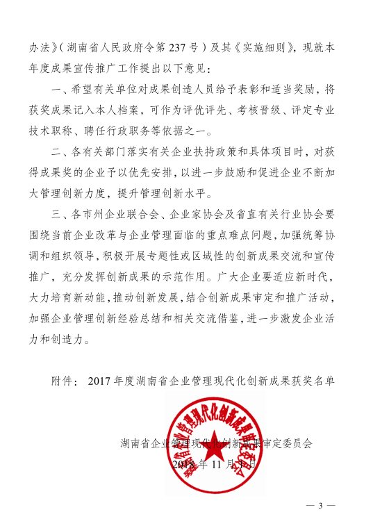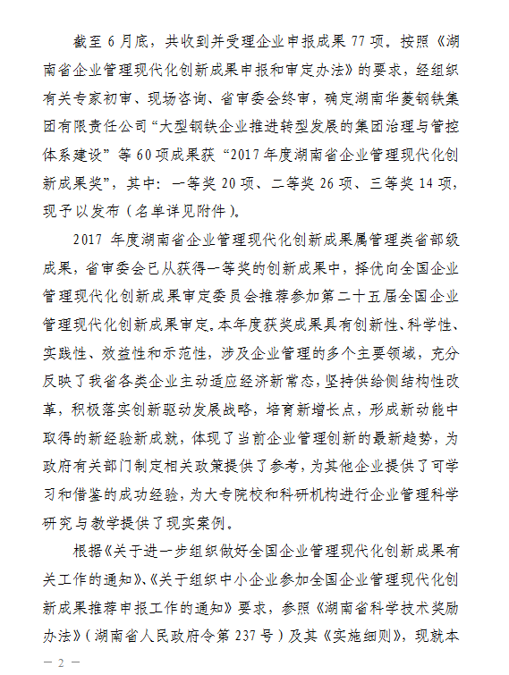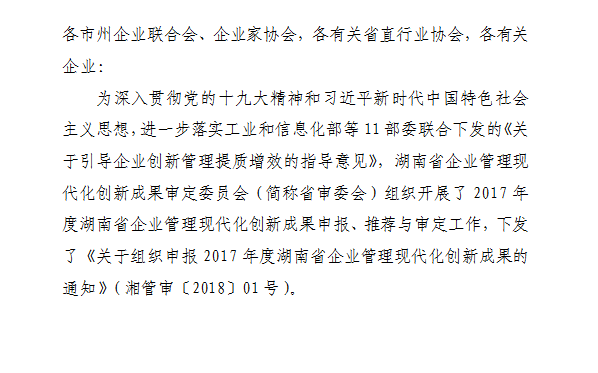 关于发布和推广2017年度湖南省企业管理现代化创新成果的通知