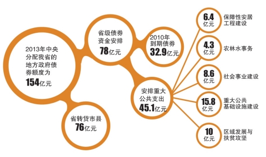 根据省财政厅提供的资料,2013年中央分配我省的地方政府债券额度为154亿元,比上年增加39亿元。省级债券资金拟安排78亿元,其中偿还2010年到期债券32.9亿元,安排重大公共支出45.1亿元。