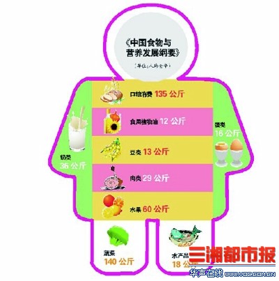 此前,国务院办公厅印发《中国食物与营养发展纲要(2014-2020)》,明确到2020年,全国人均全年口粮消费量将达到135公斤、食用植物油12公斤、豆类13公斤、肉类29公斤、蛋类16公斤、奶类36公斤、水产品18公斤、蔬菜140公斤、水果60公斤。
