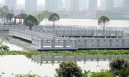 8月6日下午,长沙市西湖文化园建设现场,保洁员在九曲桥上清洁卫生。目前该园景观建筑工程及道路基本完工,绿化和配套设施已进入扫尾阶段,预计十月一日可建成开园。 田超 任梦龙 摄影报道