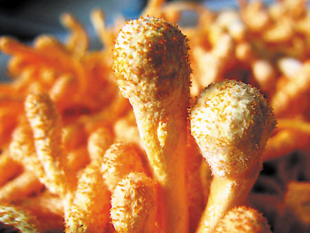 八月的长沙,烈日逼人,在浏阳市沙市镇赤马湖一个偏僻的山头,晒得黝黑的汤昭正忙碌着。4个月前,这里还是一片荒山,凭着一股子韧劲,这个“85后”的姑娘在这里整地、建厂房。如今,6间大厂房里种满了她的宝贝——北虫草。走进虫草种植厂房,一排排架子上叠放着塑料盆,里面生长着一种金黄色的菌类。揭开塑料薄膜,只见筷子粗细、6至10厘米长的北虫草正在安静地生长。