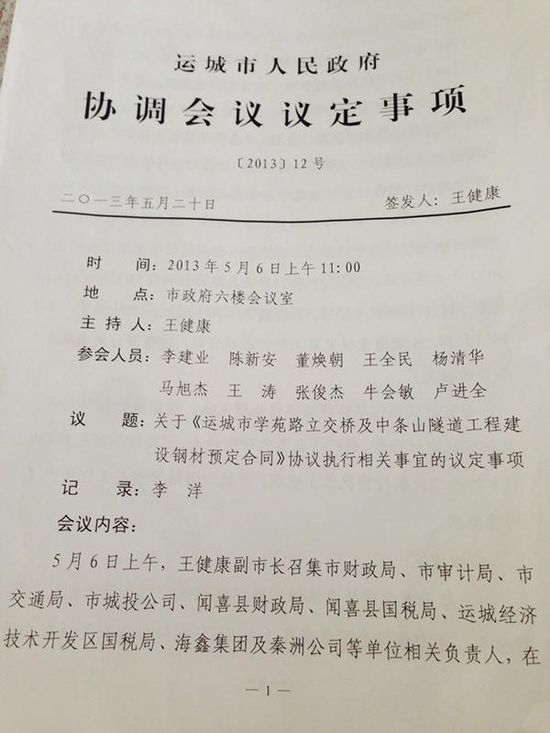 2013年5月20日,由王健康签发的《运城市人民政府协调会议议定事项》文件。