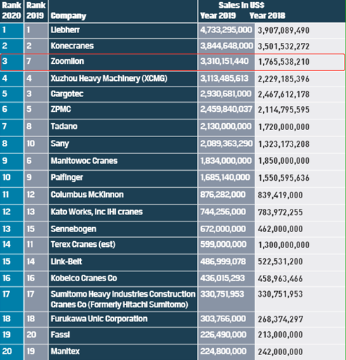 近日,英国KHL集团发布了2020年度的全球起重机械制造商20强排行榜《ICM20》。榜单显示,长沙企业中联重科起重机械销售额位列全球第三、中国第一。该榜单的发布,再一次彰显了中联重科在起重机械领域的强大实力。其中,中联重科起重机械增长态势也极为亮眼。榜单显示,中联重科年度销售增长额及增幅在前十强中排名第一,销售额增长15.45亿美元,同比增长87.5%。